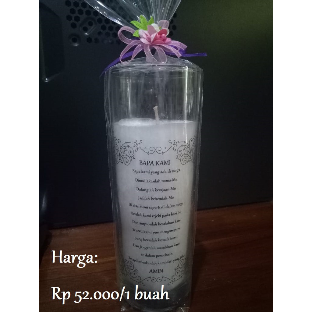 Harga Satuan.Lilin gelas berkualitas terbuat dari 100% bahan nabati. Apa bedanya dengan lilin lain?Lilin terbuat dari minyak tumbuhan yang dapat terbarukan (renewable), bukan lilin yang terbuat dari minyak bumi.Kelebihan lilin kami:- Warna lilin lebih cerah- Lilin tidak beracun- Ramah lingkungan- Asap pembakaran tidak hitam- Nyala api lebih terang- Durasi bakar lebih lama- Tekstur lilin kristal lebih elegantCocok untuk segala kebutuhan, seperti: souvenir, ibadah, dekorasi, pribadi, dllTinggi = 16 cmDiameter = 5.5 cmPilihan warna lilin:- PutihPilihan gambar rohani:- Bapa Kami- Salam MariaMari cintai bumi kita dengan menggunakan produk ramah lingkungan. Happy Shopping!^^Note:Barang dikirimkan dalam keadaan baik, free bubble wrap. Untuk menambah keamanan dalam pengiriman mohon tambahkan packing kayu & asuransi. Kerusakan dalam pengiriman tidak menjadi tanggung jawab seller. Pengiriman Lilin gelas disarankan dengan Go-Send Same Day/Instant.