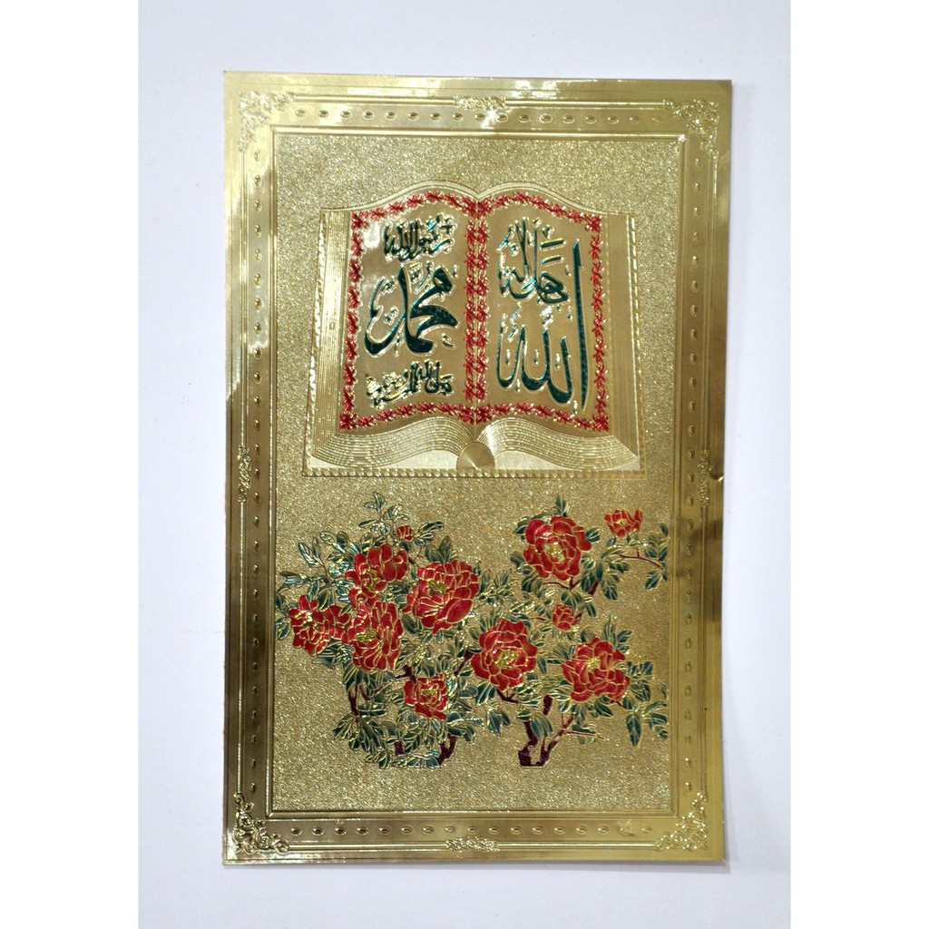 Kaligrafi Stiker Lembaran Allah Muhammad dengan hiasan bunga-bunga dibagian bawahnya. Dapat ditempel langsung atau dibi