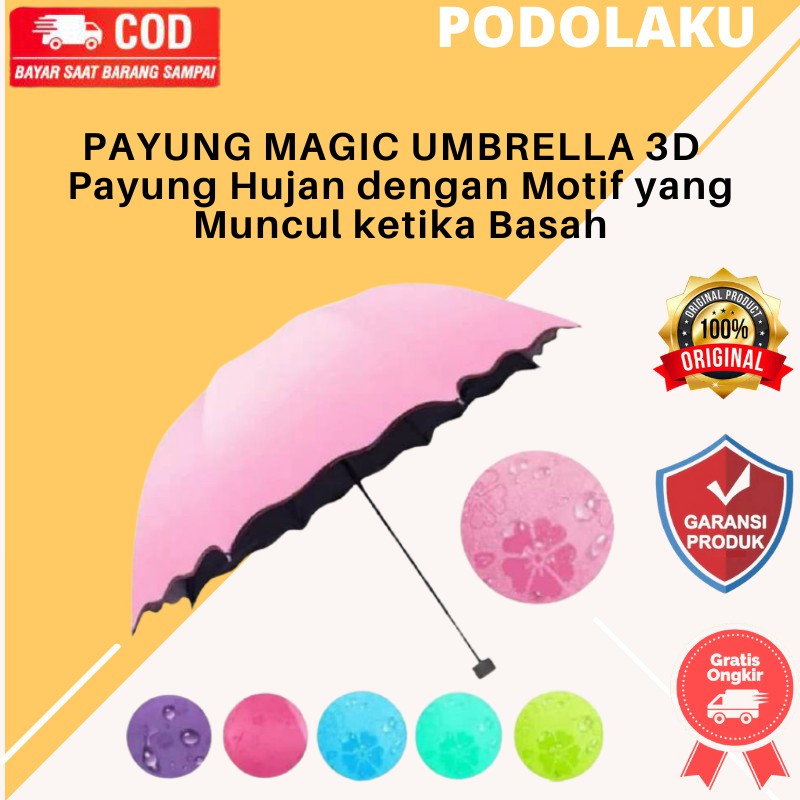 P3D - Payung 3D WARNA READY :* UNGU* ROSE RED* BEIGE* KUNING* TOSCA* PINK* HIJAU* BIRUPilihan warna akan dikirim sesuai variasi yang dipilih ketika order. Jika tidak dapat memilih varian maka tulis pilihan warna di kolom catatan / keterangan. Tanpa keterangan akan kami kirim random. Mohon maaf tidak menerima perubahan variasi warna dari diskusi atau pesan. Jika warna yang dipilih habis maka akan kami kirim warna yang ready tanpa konfirmasi terlebih dahulu. Beli = Setuju.* Warna sesungguhnya mungkin dapat berbeda. Hal ini dikarenakan setiap layar memiliki kemampuan yang berbeda-beda untuk menampilkan warna, kami tidak dapat menjamin bahwa warna yang Anda lihat adalah warna akurat dari produk.Payung Magic 3D dengan warna polos ketika kering namun akan muncul motif ketika basah / terkena air.. Bahan : 210T Vinyl high qualitySablon : 3 DimensiRangka payung : besi Handel : PlastikPanjang payung ketika terlipat : 25cmLebar payung ketika dibuka : 100 cmPanjang payung ketika dibuka : 67cmSudah termasuk sarung payung.Packing : plastikKami sudah berusaha mengemas produk seaman mungkin namun tidak menjamin barang tidak akan mengalami kerusakan dalam perjalan menuju ke tempat pembeli. Oleh karena itu segala kerusakan yang terjadi selama pengiriman diluar tanggung jawab kami. Jika ingin lebih aman kami sarankan menambahkan pembelian packing kayu di Etalase Umum." CACAT MINOR ADALAH WAJAR KARENA PRODUKSI MASAL. APABILA INGIN DI TUKAR ONGKOS KIRIM PENUKARAN PP DITANGGUNG PEMBELI "Saat musim hujan tiba memang wajib banget untuk membawa payung saat bepergian. Nah ada model payung yang cocok banget nih buat kamu yang ingin tampil unik saat hujan turun, yaitu Payung Magic 3D. Sesuai dengan namanya, payung ajaib ini bisa mengeluarkan motif 3D saat terkena air. Wuiiih, keren kan .NOTE :JIKA PESANAN DI ORDER MENGGUNAKAN PENGIRIMAN GOSEND ATAU GRAB KERUSAKAN DI LUAR TANGGUNG JAWAB PENJUAL, KARNA PRODUK SEBELUM DI KIRIM SUDAH KAMI CEK TERLEBIH DAHULU DAN KAMI PASTIKAN DENGAN KEADAAN BAIK.JIKA BERSEDIA SESUAI KETENTUAN DESKRIPSI PRODUK KAMI, SILAHKAN LANGSUNG DIORDER .#payung #3d #magic #ajaib#selamat berbelanja di podolak