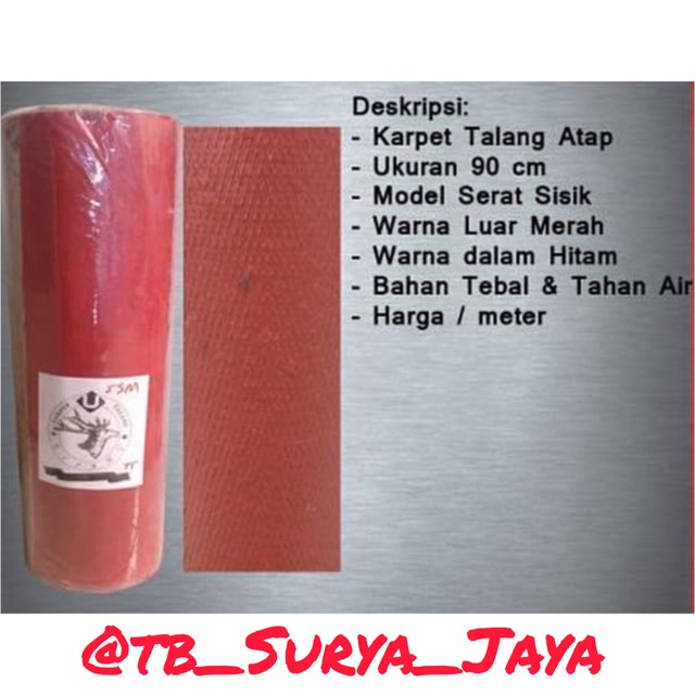 Perhatian : 1. Berat Disesuaikan Dengan Pengiriman Yang Dihitung Bedasarkan Volume2. Pengiriman Dengan Gojek Dapat Disesuaikan Beratnya Harap Chat Message3. Setiap Kelebihan Dalam Ongkos Kirim Nantinya Akan Kami Refund ke Pihak PembeliDeskripsi : - Karpet talang air- Berat 1 Kg- Ukuran 90 cm- Untuk menampung air hujan di talang- Dijual per meter- Warna merah hitam- Mudah digunakan- Praktis pemakaiannyaMohon ditanya terlebih dahulu untuk ketersediaan produk.Pengiriman menggunakan gojek sameday atau instant dan grab sameday atau instant=======================================Karpet talang merah hitam golden eagle adalah karpet talang no 1 dan terlaris di Indonesia. Produk ini berfungsi untuk menampung genangan air hujan yang jatuh di bagian atap, untuk kemudian dialirkan ke bawah. Kemudian produk ini dapat menghalangi atau menghambat kebocoran di talang, asbes dan genteng. Dijual per roll atau per meter. Pemakaiannya praktis dan sangat disarankan menggunakan gunting biasa untuk pemotong produk ini. Produk ini praktis dan sangat mudah diatur dan digunakan. Dikemas dengan kemasan yang rapih.#tokobangunan #jualbahanbangunan #tokomaterial #tokobangunandepok #jualkarpettalang #jualmurahbanget #tbsuryajaya #tokobangunanonline #jualkarpetmerahhitam #jualalumunium #jualsengplat #jualsenggalvanis #jualkawat #jualkarpet #juallemkarpet #jualpakukarpet #jualsistaben #jualaquaproof #jualnodrop #karpettalangalum