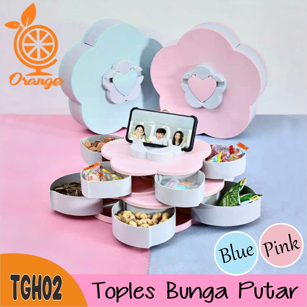 ROMO Terbaru Toples Putar motif Bunga Mekar terdapat 10 wadah dengan 2 tingkat/susun dan pada bagian tutup ada dudukan untuk HP ringan.praktis dan dapat dibawa kemana saja.dengan Desain yang cantik dan menarik dapat memperindah tampilan dapur/ruang tamu anda ketika ada acara. - Terdapat 10 tempat penyimpanan kue kering.- Lebih Hemat, daripada Anda harus membeli 5 toples sekaligus biaya yang keluar lebih banyak.- 1 Toples bisa untuk 10 wadah makanan, yang sudah pasti hemat dan efisien.- Warna yang begitu cantik & elegan. - Bisa buka tutup dan mudah dalam membukanya- Bisa untuk menempatkan HP di atas toples- Bisa juga untuk toples Bumbu- Kotak Buah Kecil dengan Kelopak Style yang Creative- Terdapat Putaran Buka dan Tutup- Bahan yg Aman Plastik PP food grade ## Deskripsi TGH-1 :- Tidak Mudah Pecah- Praktis-7 Slot Penyimpanan - Ukuran 30cmx15cmx15cmUkuran Toples besar saat ditutup 27cm × 27cm × 13cmSaat di buka 5 wadahnya menjadi 43cm × 43cm × 13cmREADY BIRU DAN