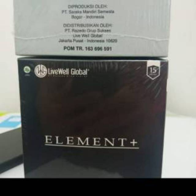 E+ (Element Plus) dari LiveWell Global (LWG) adalah sebuah campuran botani antioksidan. Kombinasi dari antioksidan, anthocyanin, asam lemak esensial, dan phytosterola.barcode dipotong Manfaat konsumsi secara rutin (cukup 1 sachet per hari):1. Sebagai nutrisi kulit dalam membantu menyehatkan dan menghaluskan permukaan kulit.2. Mencegah penyakit darah tinggi serta penyumbatan darah.3. Mencegah perubahan sel normal menjadi sel kanker.4. Menjaga kesehatan jantung.5. Mengendalikan kekentalan darah.6. Menyeimbangkan sekresi insulin.7. Membantu penurunan berat badan.8. Sebagai detoksifikasi.Di dalam ELEMENT+, kandungan unik resveratrol berpadu sengan kolagen nabati dan sejumlah buah pilihan yang sangat diperlukan untuk membantu memperbaiki kerusakan akibat radikal bebas dan melindungi sel terhadap kerusakan di masa yang akan datang. Penyajian dalam bentuk gel memungkinkan super-antioksidan ini dapat diserap sempurna oleh tubuh dalam waktu 3-15 menit saja.Dalam 1 sachet Element+ terdapat begitu banyak manfaat bagi tubuh Anda. Tunggu apalagi? Sayangi tubuh Anda dan maksimalkan hidup sehat Anda dengan El