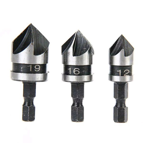 3PCS ¼ Hex 5 Flute 12-19mm Countersink Drill Bit for Wood Metal Quick ChangeDescription:100% brand new and high quality. 1. 2. Five Flute Chamfer Debur Countersink. 3. 4. 5 Flute Counter Sinks. 5. 6. Carpentry Countersink Drill Bit Set. 7. 8. Suitable for all Woods and Soft Metals. 9. Features:Material: high carbon steelsize:12mm 16mm 19mmShank diameter: 6.35mm (¼ inch hex shank)Surface treatment: blackening treatmentHeat treatment: high frequency quenching, enhance the hardness.Applicable scope:suitable for wood plastic cutting chamfering etc.angle:90 d