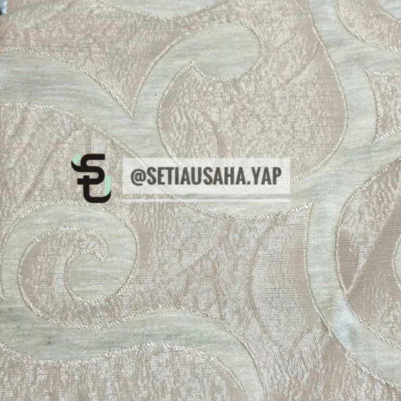 ========= Baca caption dengan teliti, mohon chat dengan admin untuk konfirmasi stock, karena kami ada toko offline, stock dapat berubah setiap saat =======Nama: LACEYBahan: premium chenille + gold thread jacquardLebar: 1.40MAplikasi: sofa, kursi makan, kursi kayu jati, jepara, kursi antik, dllHighlight: Design dan warna mewah dengan pilihan warna cream dan dark brown. Bahan chenille sangat tebal. Design sangat menarik dengan ditambahnya uliran jacquard dari benang emas. Cocok untuk gaya minimalis modern atau padukan dengan kayu jati untuk berkesan lebih mevvahVarian: CreamD brownNote:1. Baca syarat & ketentuan (s&k) berbelanja di toko kami. Membeli = mengerti dan setuju. Kami tidak menerima complain/ retur jika kesalahan di pihak pembeli2. Mayoritas dari foto-foto adalah realpic. Ada kemungkinan perbedaan warna dikarenakan pencahayaan dan perbedaan jenis layar yg digunakan3. Jika ada bahan yg kosong/ cacat grade B diwaktu pengecekan akan kami informasikan kepada pembeli. Jika pembeli tidak merespons dalam 2x24jam, akan kami anggap setuju & kami kirimkan. 4. Pengepakan kami lakukan sebaik mungkin menurut standar kami. Jika anda memerlukan packing tambahan, silahkan tambahkan packing5. Pengiriman: Max 2x24 jam. Keterlambatan/ kerusakan paket di perjalanan di luar tanggung jawab kami.Happy sho